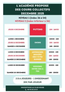 Découvrez le calendrier des cours collectifs de DÉCEMBRE 2025 pour les joueurs de niveau 1 (index de 54 à 36).